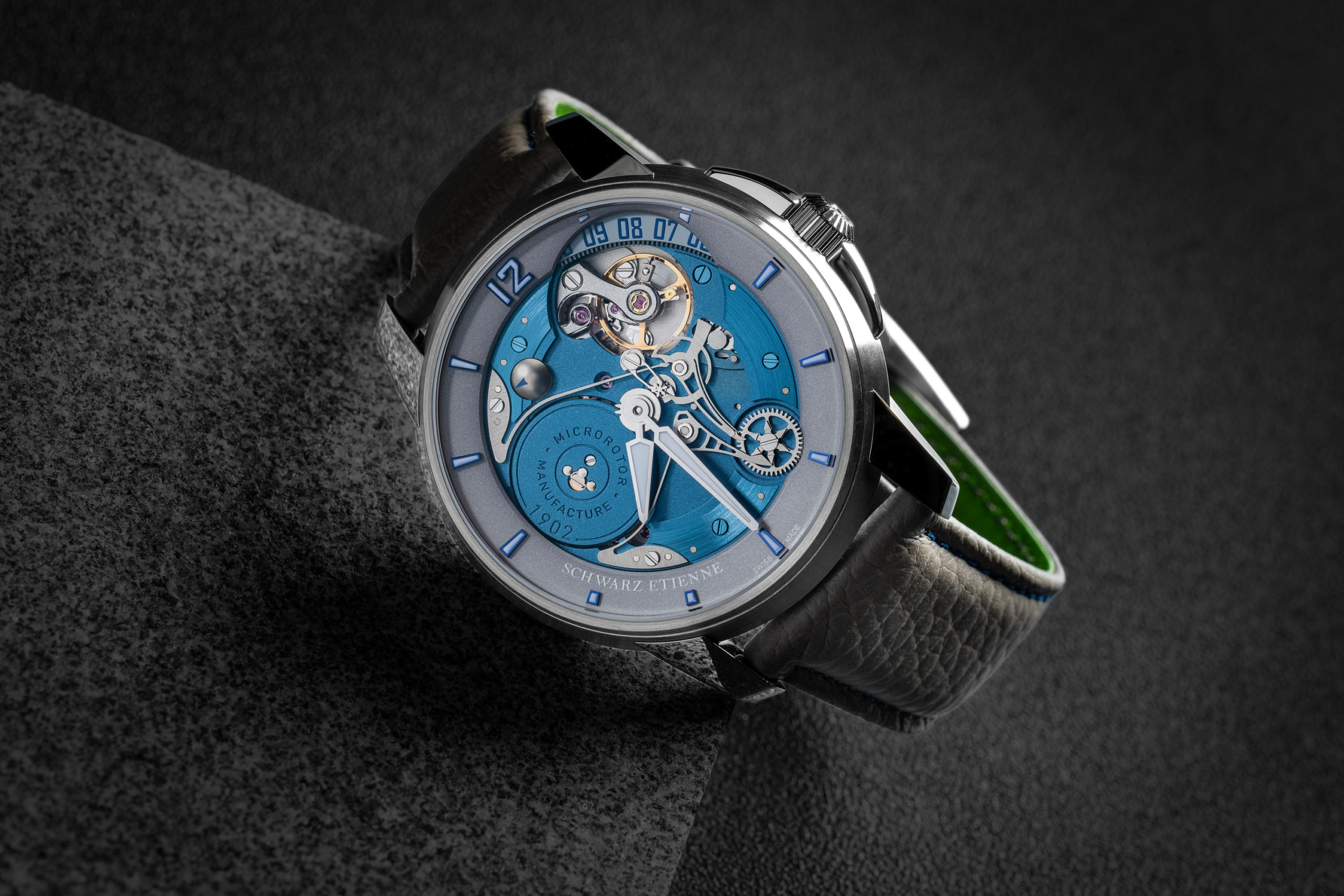 | Cadran | laiton, gris et bleu appliques rhodiées avec Super-LumiNova® Disque de date en rhodium et bleu. Micro-rotor gravé |